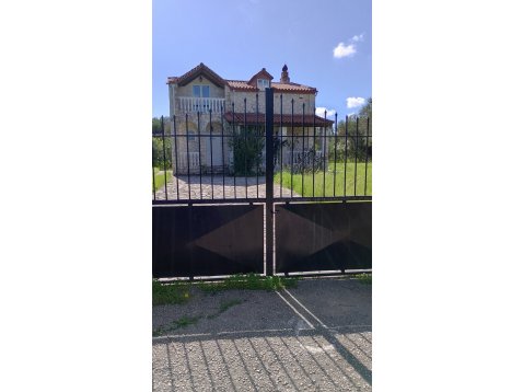 The villa sits on a generous 1,525 sqm plot with beautiful views over olive groves and rolling hills. A stone wall encloses the property, while tall cast‑iron gates open onto a stone‑paved driveway with ample parking. Stone pathways lead around the villa to the swimming pool and BBQ area, creating a harmonious outdoor environment perfect for entertaining or unwinding.